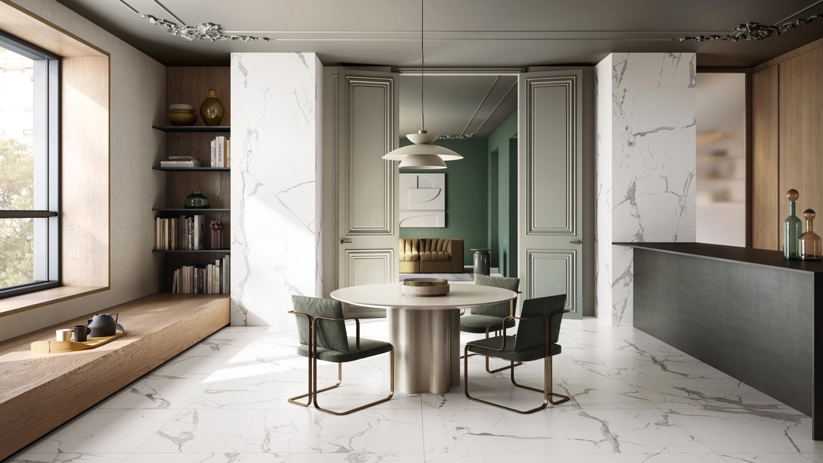 Мрамор остается одним из самых востребованных материалов в дизайне интерьеров благодаря своей способности создавать атмосферу статусности и визуальной глубины. Italon выпустил коллекцию, которая воспроизводит не только классические сорта вроде Статуарио и Калакатты, но и редкие разновидности — от тосканского камня до мадагаскарских пород с нестандартной графикой. Линейка построена так, чтобы охватить весь спектр интерьерных задач: от нейтральных фоновых решений до выразительных акцентных поверхностей.