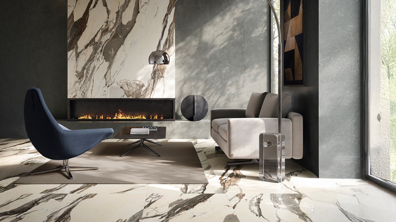Мраморная часть коллекции включает два цвета — Калакатта Ворм с теплыми прожилками и Эксклюзив Грин с зеленоватыми включениями. Оба доступны в формате 80x160 см с патинированной обработкой, которая добавляет поверхности матовость и тактильность. Такое сочетание бетона и мрамора работает на контрасте: индустриальная графика первого смягчается благородством второго, создавая баланс между брутальностью и изысканностью. Это решение подходит для проектов, где нужно соединить современную эстетику с элементами классики.