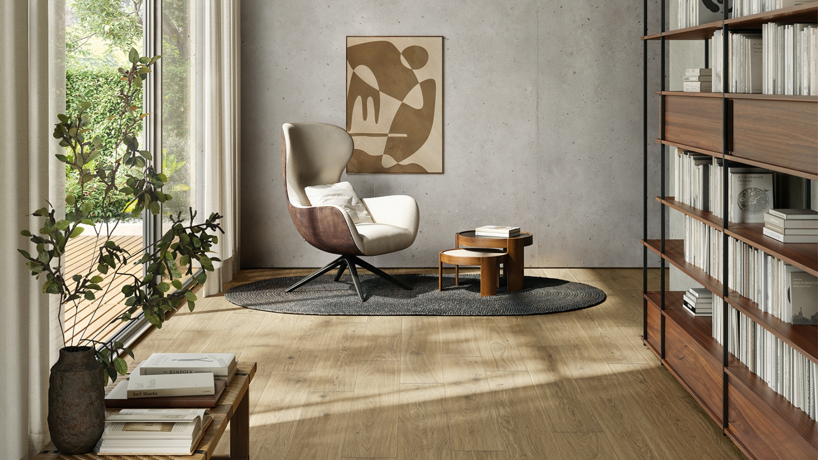 Деревянная составляющая представлена керамогранитом Оак и Пэппер в формате 20x160 см с натуральной поверхностью. Эти варианты добавляют пространству тепла и уюта, создавая контраст с более холодными оттенками бетона и мрамора. Плитку под дерево используют для зонирования — например, выделения зоны отдыха в гостиной или спальне, где важна атмосфера камерности. Узкий формат визуально вытягивает помещение и имитирует укладку паркетной доски.