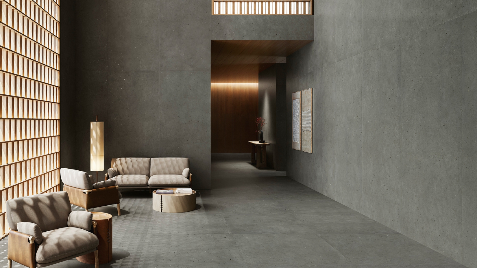 Основу линейки составляет керамогранит, воспроизводящий шлифованный бетон с характерными вкраплениями разных форм и оттенков. Пять цветов — Пьюр, Даст, Сильвер, Айрон, Блэк — охватывают диапазон от светлых нейтральных до глубоких темных тонов. Поверхность передает легкую структуру исходного материала, создавая неоднородный фон, который добавляет интерьеру динамики. Базовые форматы 60x120, 120x120 и 80x160 см при толщине 9 мм с натуральной поверхностью подходят для укладки в жилых и коммерческих пространствах — от квартир до офисных лобби и ресторанов.
